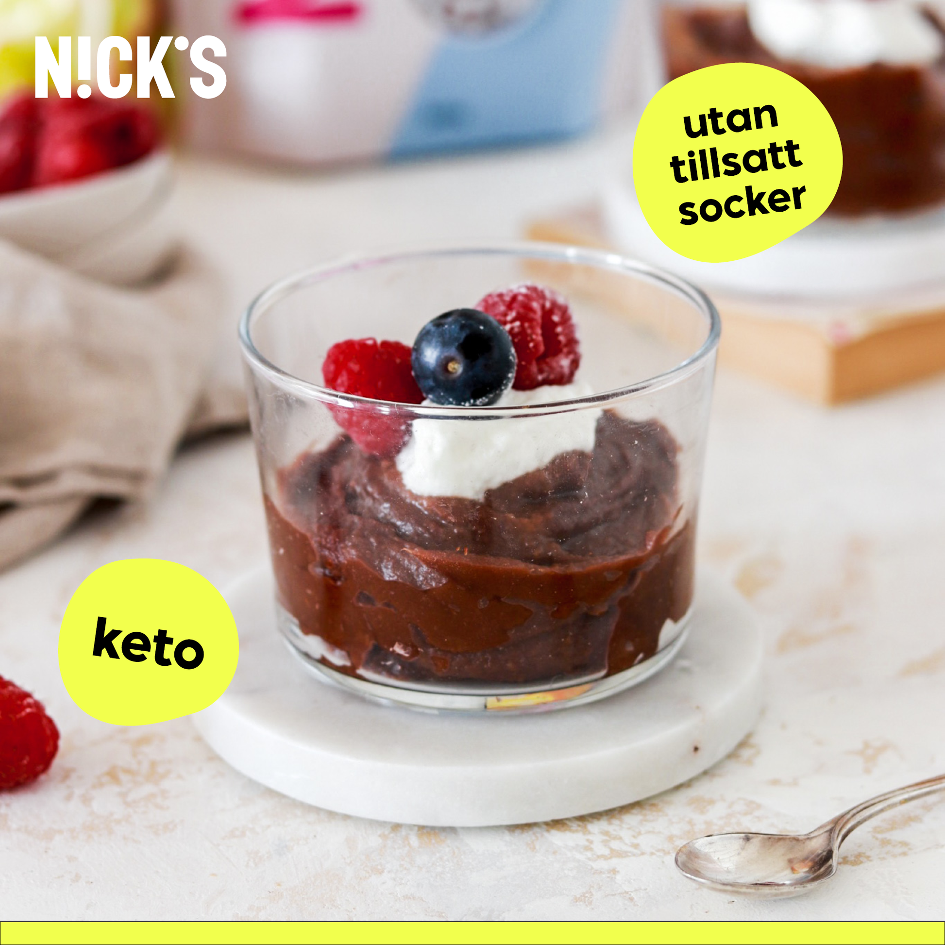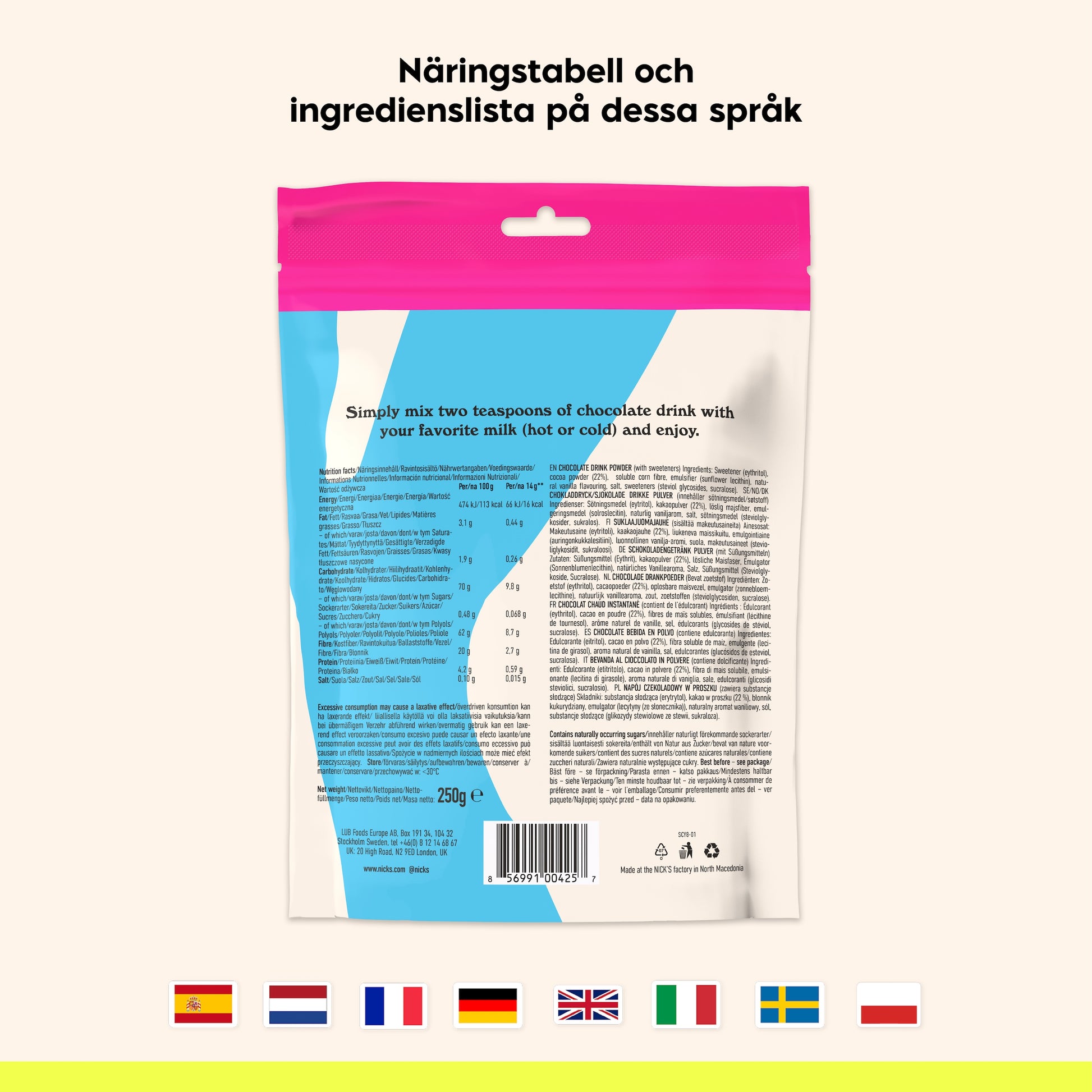 Sötningsmedel (erytritol), kakaopulver (22%), löslig majsfiber, emulgeringsmedel (solroslecitin), naturlig vaniljarom, salt, sötningsmedel (enzymatiskt framställda steviolglykosider, sukralos). Kan innehålla spår av mjölk/mælk.